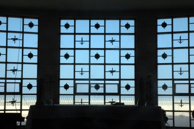 memorial window facing the Mediterranian Sea (and Italy) and annexes of filled with ossiaries - the remains of many Italian soldiers, many simply "Incognato".