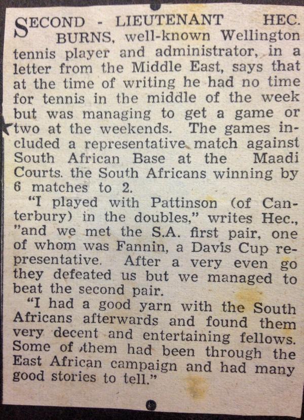 In October 1941 Hec was called on to organise a tennis tournament at Maadi Camp. This he was well qualified to do, having been Secretary of the Wellington Lawn Tennis Association.