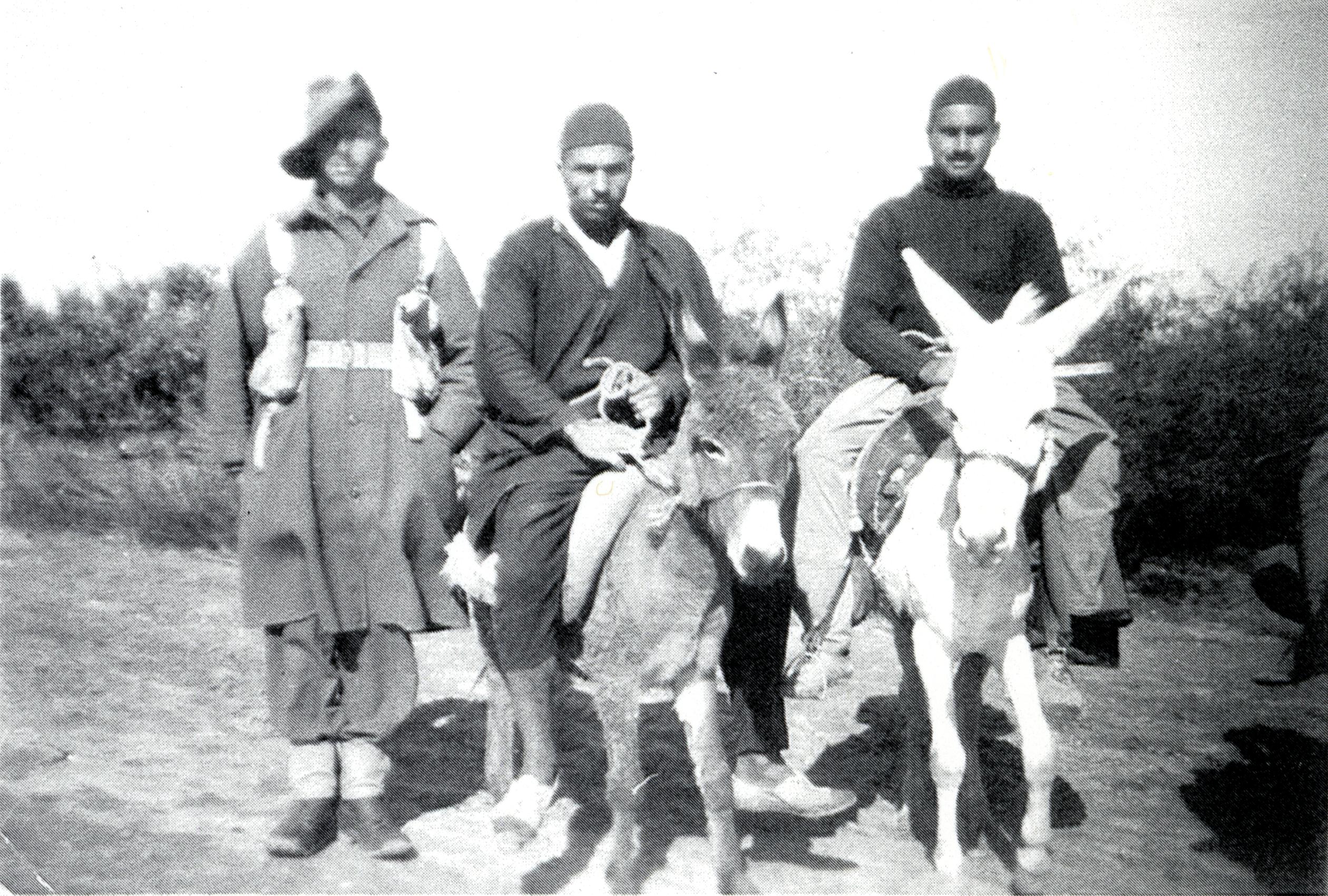 Two locals on donkeys, accompanied by an Australian soldier in full kit. |